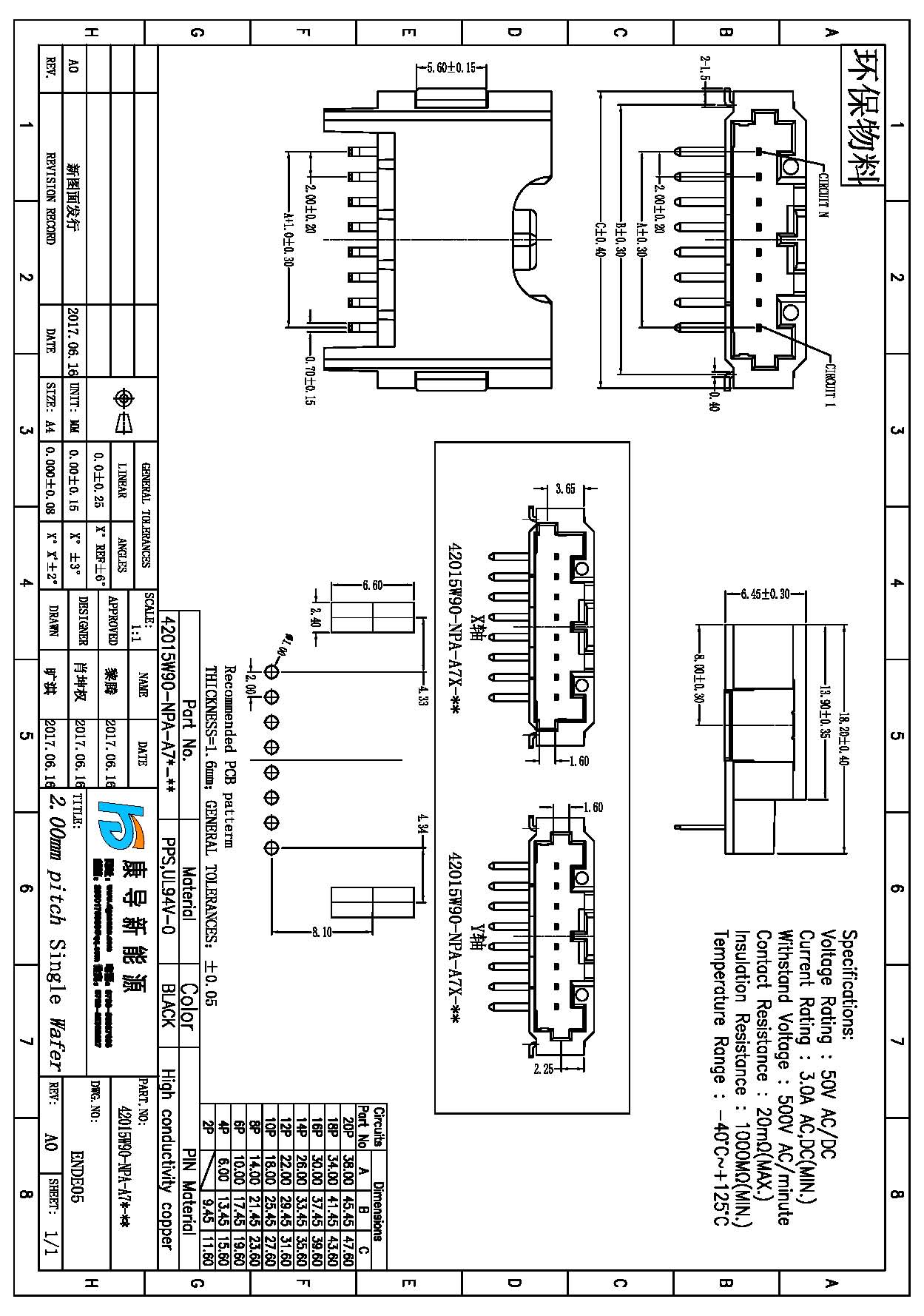 Spec:2.0mm PITCH Single row horizontal type WAFER